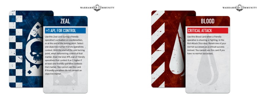 En outre, cette extension propose un jeu de 32 cartes « Sang et Zèle » : Les cartes Zèle représentent des pouvoirs de protection, de compétence et de guidance, avec des effets tels que la guérison, la réduction des dégâts des attaques et la possibilité de tromper la mort. Les cartes Sang représentent l’agressivité et la soif de sang, avec des effets ajoutant +D3 dégâts, +1″ au mouvement (y compris la Charge) et doublant les actions Combattre et Tirer.